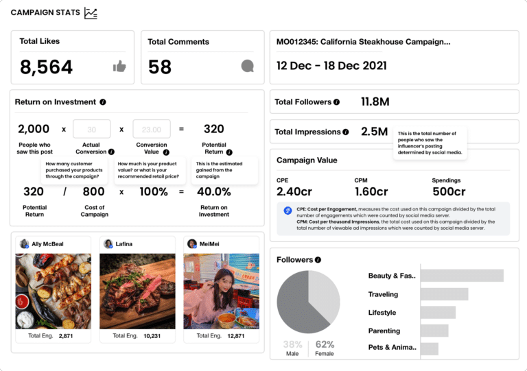 Measure your campaign’s success with advanced analytics dashboards. Calculate your ROI, total earned media value, impressions, and reach and view a summary of all media engagements.