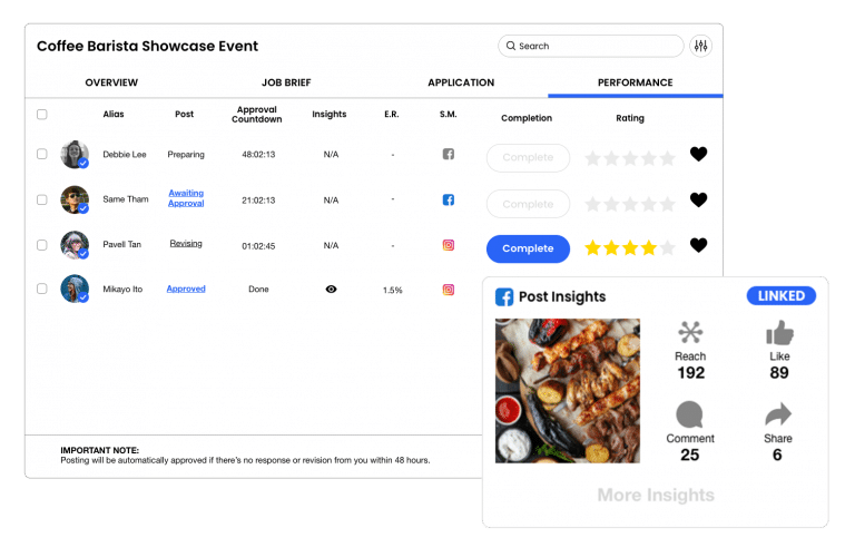 Find all the essential tools for managing your campaigns in one spot: modify briefs, approve content drafts, and process payments.